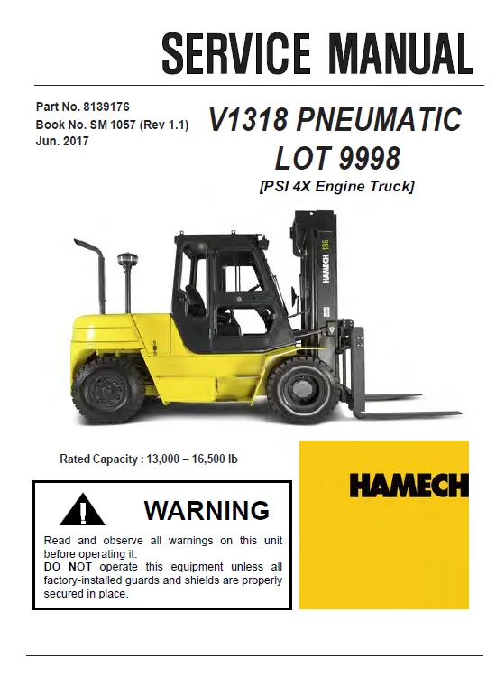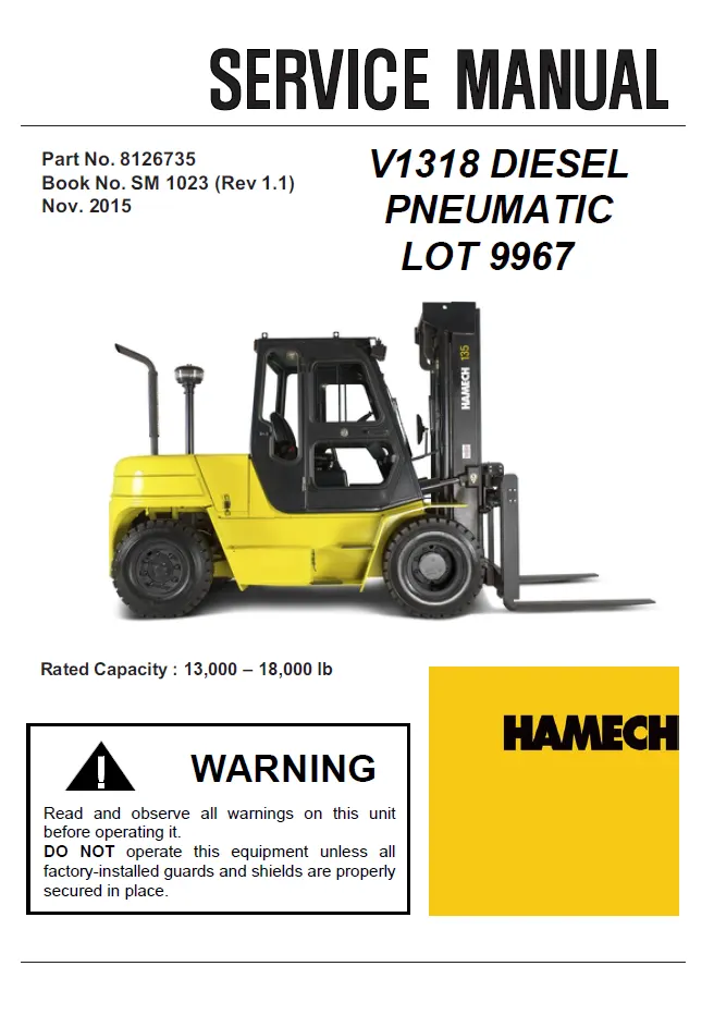 The Hamech V1318 Manual (PDF format) is an essential resource for anyone operating, maintaining, or repairing the Hamech V1318 forklift. This detailed guide includes step-by-step instructions, diagrams, and troubleshooting advice that help both technicians and operators work with confidence. Whether you are a seasoned professional in the material handling industry or a first-time user, having access to this manual ensures safer and more efficient forklift operation.