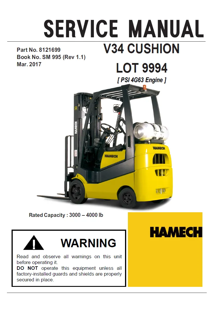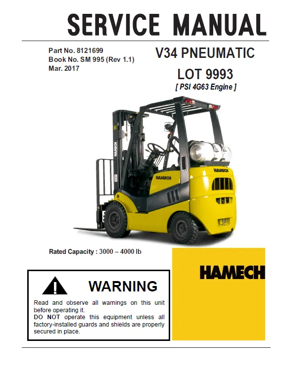 The Hamech V34 Manual (PDF format) is an essential resource for anyone operating, maintaining, or repairing the Hamech V34 forklift. This detailed guide includes step-by-step instructions, diagrams, and troubleshooting advice that help both technicians and operators work with confidence. Whether you are a seasoned professional in the material handling industry or a first-time user, having access to this manual ensures safer and more efficient forklift operation.