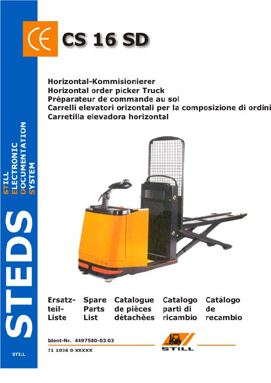 Download Still CS16-SD order picker operator’s guide, user repair and service instructions manual. View operation and maintenance book on tablet and smartphones. You may also download parts documentation catalog, parts book pdf. Take a look at the hydraulic system scheme, electrical wiring diagram, circuit schematic and fault-error codes. And this way you troubleshoot in your workshop.