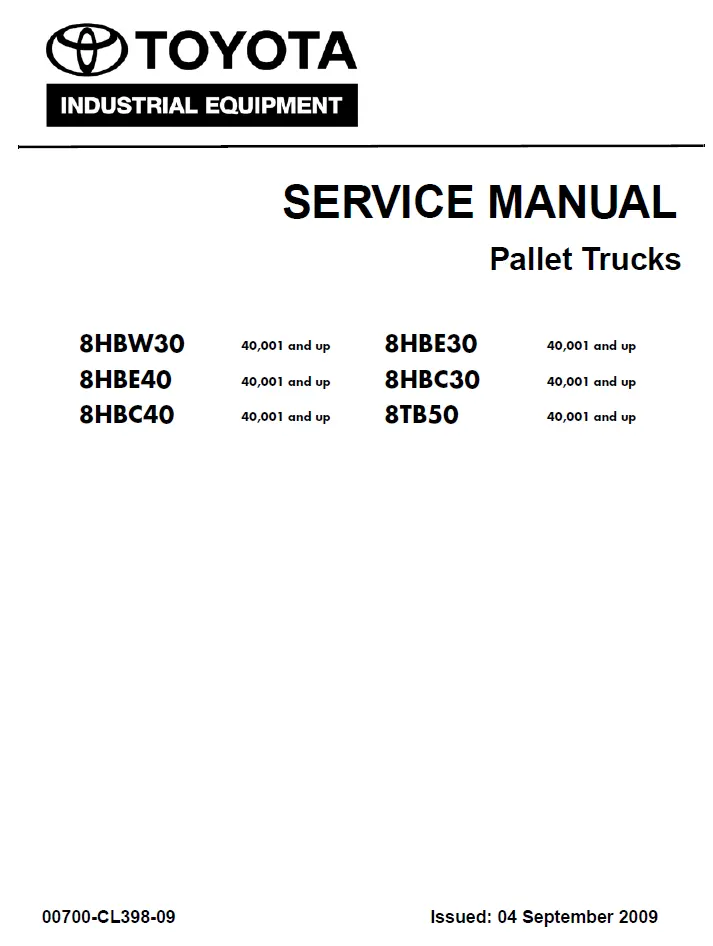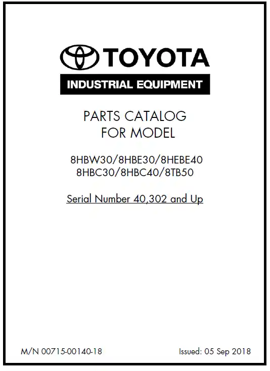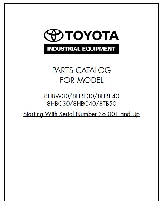The Toyota 8HBW30 Parts Manual provides detailed technical information essential for proper maintenance and repair of your electric pallet truck. This comprehensive PDF includes the complete parts catalog, making it easier to identify replacement components and part numbers.