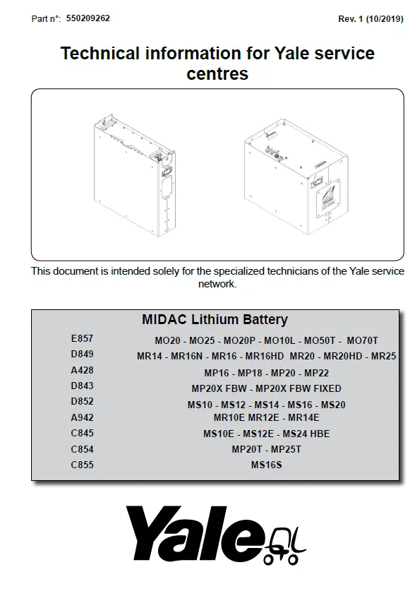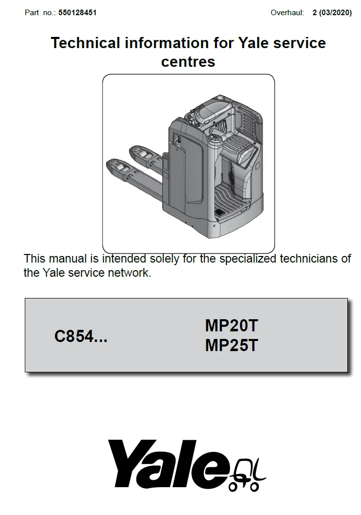 The Yale MP20T Manual is the official factory-issued service and maintenance guide for the Yale MP20T electric pallet truck, offering complete technical support for technicians, service teams, and warehouse operators. Designed for high-efficiency and precision, this manual covers all major components and systems—including the traction motor, control unit, hydraulic lift system, brake assemblies, steering, and electrical circuits.